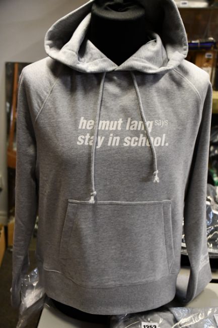 An as new Helmut Lang "Says Stay in School" hoodie in grey (S).