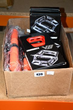 Six as new DMR Bikes V8 pedals in Red and Six as new DMR Bikes Deathgrips (5x Orange, 1x Blue).