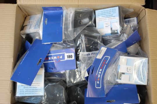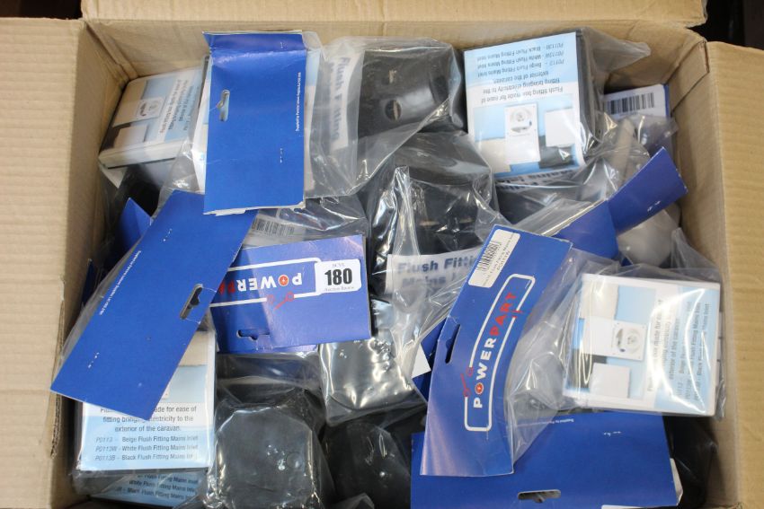 A quantity of as new PowerPart Caravan Flush Fitting 240v 3 Pin Mains Plug Inlet Boxes in black and white (Approximately 35).