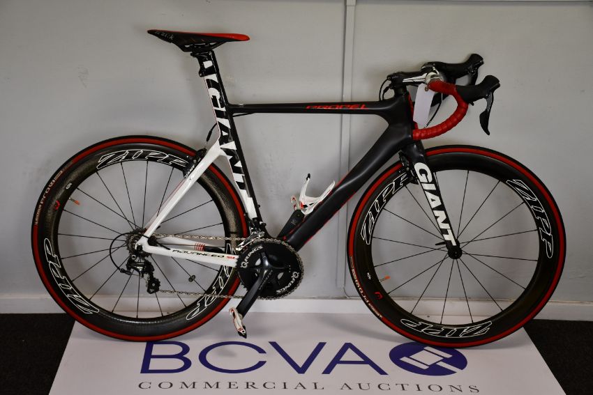 A gent's 'Aero' racing bicycle: Giant Propel Advanced SL (Size medium, suit rider around 5'10"), Full Carbon Frame/Fork with Integrated Seat Pin, Shimano Ultegra 11 Speed Shifters, Front and Rear Mechs, Chain, Bottom Bracket and Chainset (172.5mm Cranks), Fitted with Rotor 50-34 Aero 'Q' Rings (Original Ultegra 50/34 Rings included), Shimano Durace Cassette (11-25), Giant (TRP) Aero Cantilever Brakes, Zipp 404 Carbon Fibre Deep Section Wheelset (16 hole front, 20 hole rear) and Matching Wheel Skewers, Michelin Pro 4 Comp Tyres, Giant Contact SLR Carbon Aero Handlebar (42cm Centres at Hoods), Giant Contact SLR Carbon Stem (100mm), Fizik Arione R3 Carbon Railed Saddle, Elite Bottle Cage, Time Xpresso 8 Pro Pedals, Approximately 7.3kg (16.1lbs).