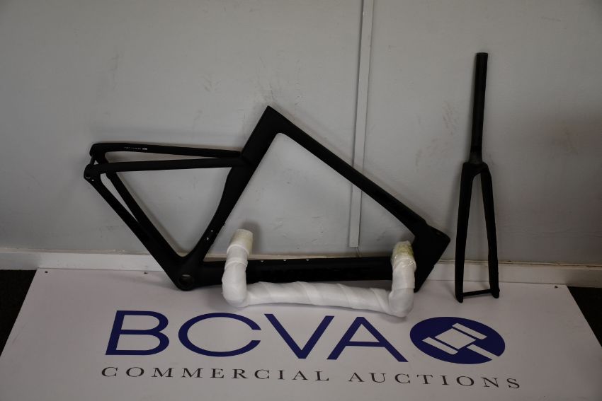 A men's as new 58cm carbon fibre 'Aero' bicycle frameset (Possibly Chinese) comprising frame, fork, seatpost, handlebar and stem and all associated hardware.