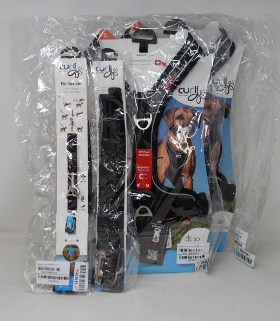 A quantity of as new Curli dog accessories to include; Curli dog finder harnesses and Curli adjustable dog leashes.