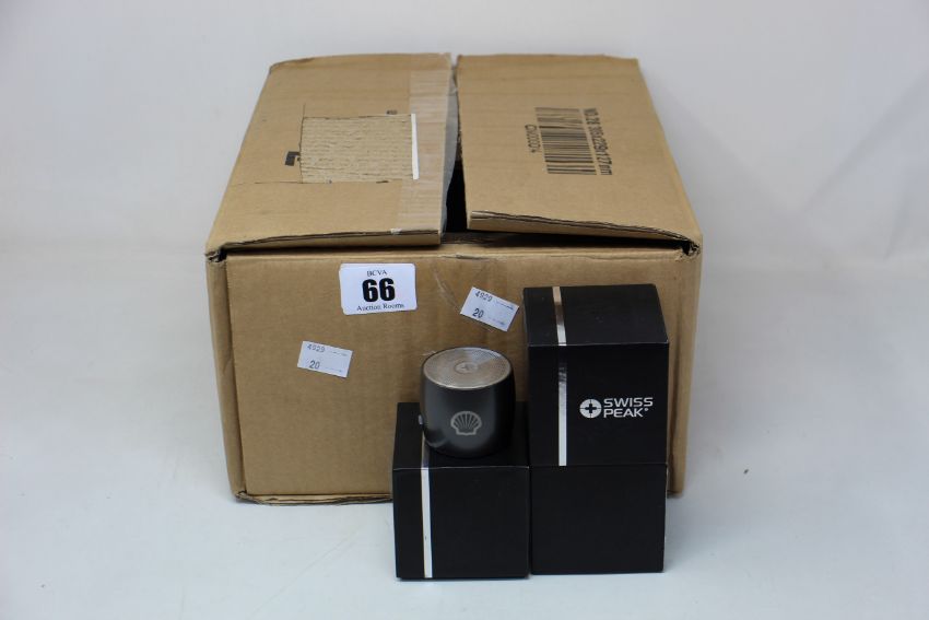 Fifteen Swiss Peak mini wireless speakers with Shell branding (Some boxes have some damage).