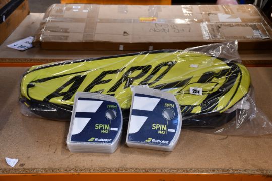 A Babolat RHX12 Pure Aero Tennis Bag in black and yellow and twelve Babolat RPM Rough String Sets (125/17 and 130/16), all as new.