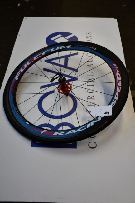 A pair of as new Fulcrum Racing Speed XLR deep section carbon fibre 700c tubular wheels, Shimano Free hub, ceramic bearings, fitted with Continental handmade competition tubular tyres c/w matching wheel skewers.