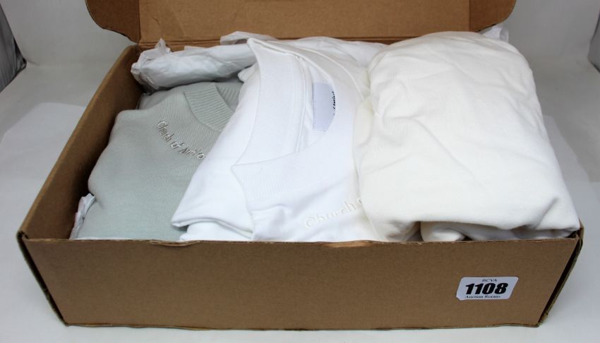 Two as new Church of Antioch Clothing T-shirts (L) and a sweatshirt (L).