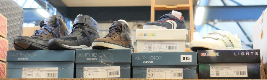 Five pairs of boxed as new Geox shoes/trainers - Flexyper B (UK 5), J Mattias B (UK Kid's 11.5), J Teram B (UK 4), J Skylin G (UK 3) and J Poseido B (UK Kid's 10).