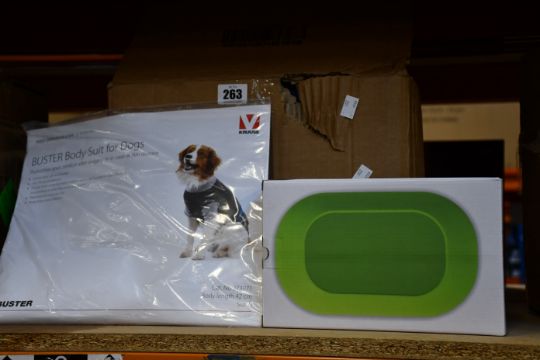 A quantity of Buster dog products to include Buster body suits, Incredibowl for long eared dogs and other related items.