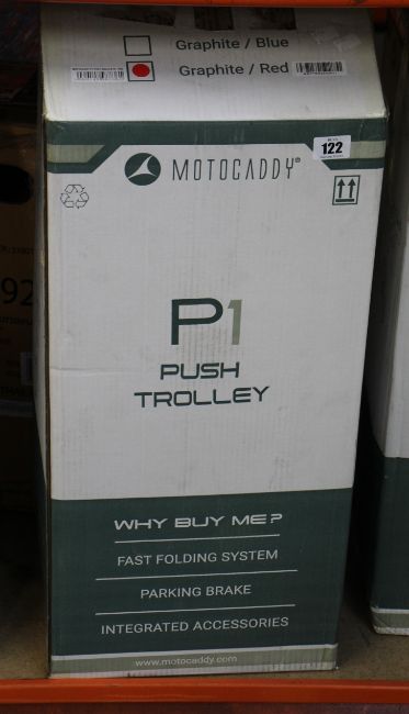 A Motocaddy P1 Push Trolley in graphite and red.