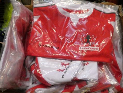 Thirty sets of children's Little Kickers football shirt and shorts sets together with assorted accessories.
