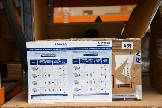 A Kern counting scale with testing block, shore hardness tester and a Kern lead-acid battery.