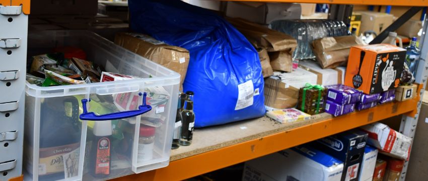 A shelf of food, drink and related items.