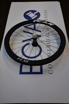 A pair of as new Ican 'FL50' deep section 700c carbon fibre bicycle wheels, tubeless ready, DT Swiss 350 straight pull centre lock hubs, Shimano free hub body (For disc brakes).