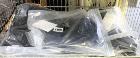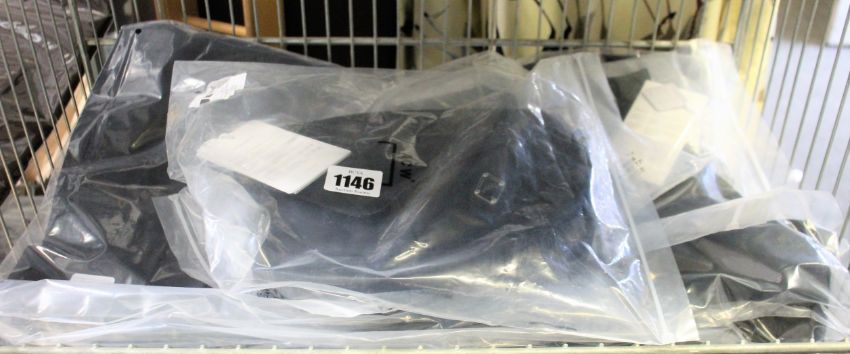 Five pairs of as new A.C.W. Core Mod Lux shorts in black (3 x M, 2 x L) and two A.C.W. working black professional envelope bags.