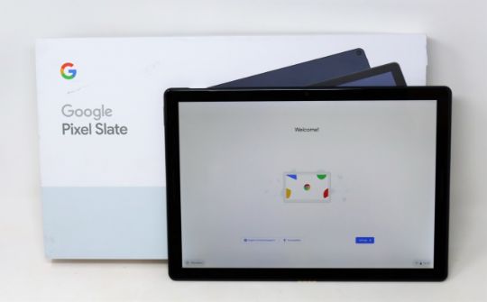 A pre-owned Google Pixel Slate Tablet in Midnight Blue with 8th Gen Intel i5 Processor, 8GB RAM, 128 SSD running Chrome OS (Boxed, UK plug USB-C charger cable included).