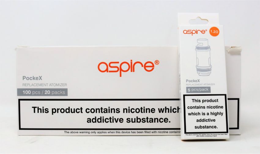 One hundred packs of five Aspire PockeX Replacement 1.2 Ohm Coils (Boxes opened) (Over 18's only).