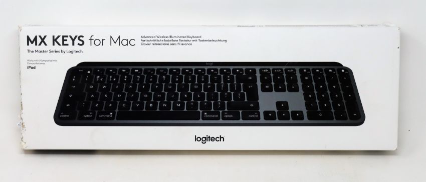 A boxed as new Logitech MX Keys keyboard for Mac in black/space-grey (box opened) (damage to outer packaging)