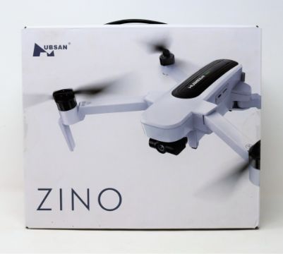 A boxed as new Hubsan Zino Folding Quadcopter Drone (UK plug adapter required) (Damage to box).