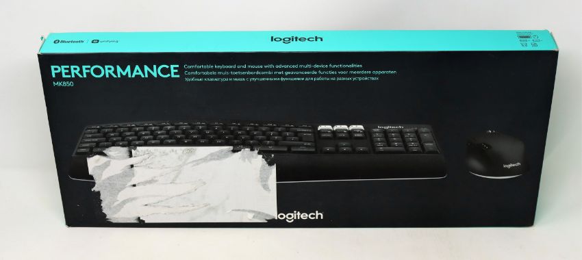 A boxed as new Logitech MK850 Wireless Keyboard and Mouse in Black (Box sealed, some damage to box).
