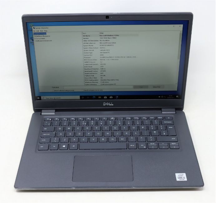 A pre-owned, boxed 14" Dell Latitude 3410 laptop with intel core i5-10210U 1.60GHz processor, 8GB RAM and 256GB SSD in grey (packaging complete with charger) (Service tag: CNNJ563)