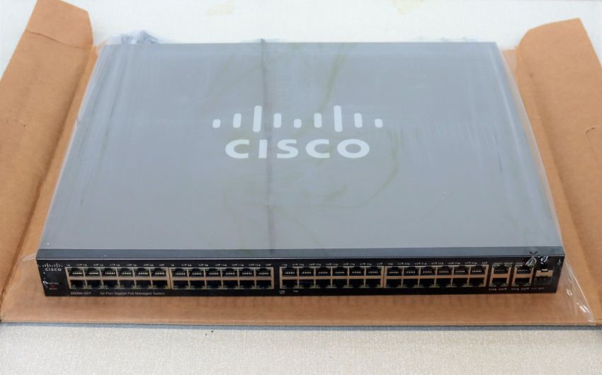 A pre-owned Cisco 52 port managed network switch (PN: SG300-52P)