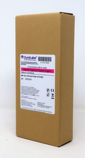 A box of 12x QuickLabel magenta ink cartridges (140ml) for AstroNova QL-120X label printer.