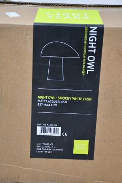 A boxed as new Light Years night owl table lamp in Smokey White/Ash.