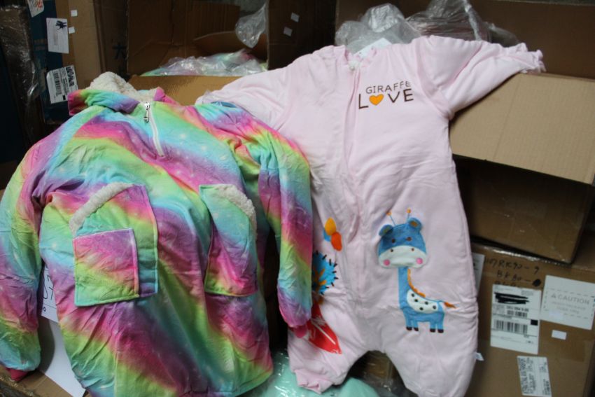 A quantity of assorted clothing and related items to include children's Mikafen wearable sleeping bags.