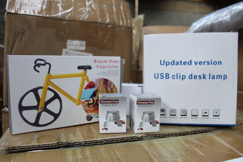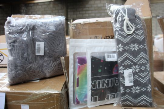 A pallet of miscellaneous items to include hot water bottles, USB clip desk lamps, fluffy cushion covers and kids' aprons.