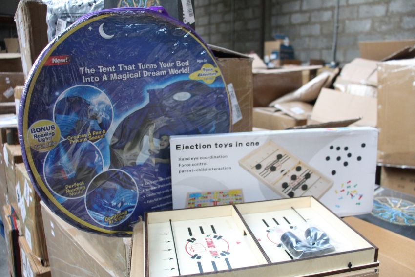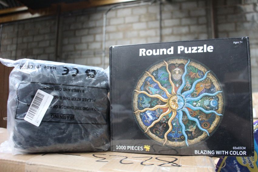 A pallet of as new miscellaneous games and leisure items to include free-standing punching bags, Intelligent Hula Hoops and hand-eye co-ordination board games.