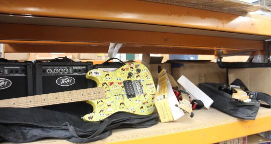 A Rock It Out 30" electric guitar, a Spongebob Squarepants 3/4 electric guitar with bag and a child's Elevation electric guitar with bag together with three mini amps; Elevation EG-10J Peavey backstage and Peavey Backstage II, a quantity of accessories and a quantity of guitar based DVD's.