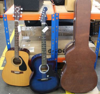 A pre-owned Lindo LDG-933CTBLS acoustic guitar and a Yamaha F-310 acoustic guitar with a hard case.