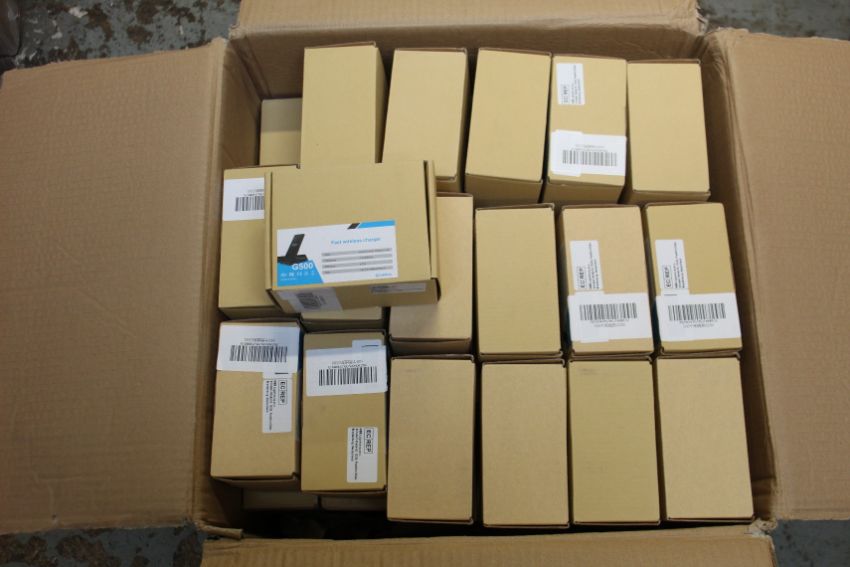 A box of CubeVit fast wireless chargers (G500) (Approximately 90 items).