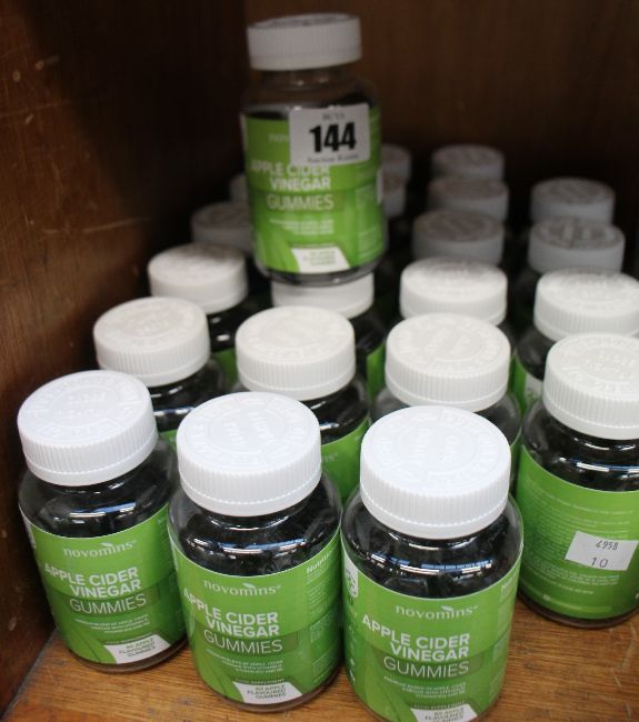 A quantity of Novomins Apple Cider Vinegar gummies (60 gummies per jar) (Approximately 20 items).