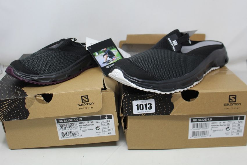 Three pairs of as new Salomon RX Slide 4.0 (2 x men's UK 12.5, 1 x women's 3.5).