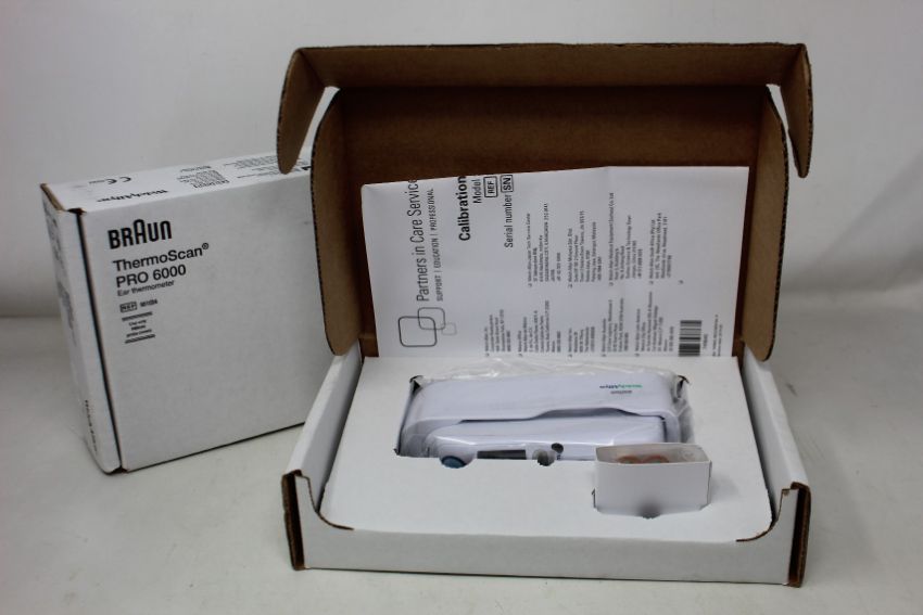 A boxed as new Welch Allyn Braun ThermoScan PRO 6000 ear thermometer with cradle.