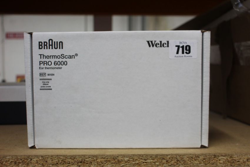 A boxed as new Welch Allyn Braun ThermoScan PRO 6000 ear thermometer with cradle.
