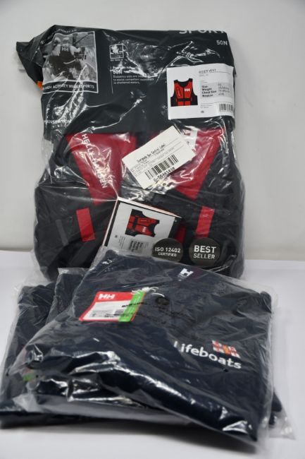 Three as new Helly Hansen Lifeboats crew polo tops (XL) and a Helly Hansen Rider vest (XS).
