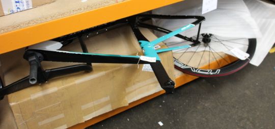 A gents as new carbon fibre 'Aero' racing bicycle frameset c/w handlebar and stem, carbon seat post, size 52cm, for disc brakes only and a pair of deep section 50mm carbon wheels, 6 bolt disc hub, Shimano free hub body.