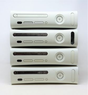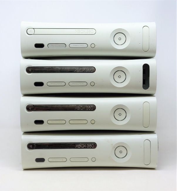FOR PARTS OR REPAIRS - Four pre-owned Xbox 360 consoles in off-white (console units only - no cables/controllers/storage drives) (untested) .