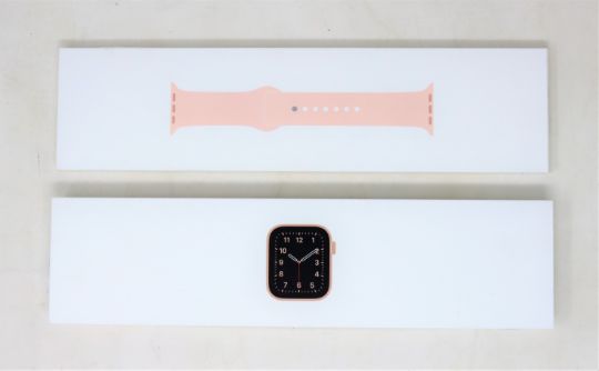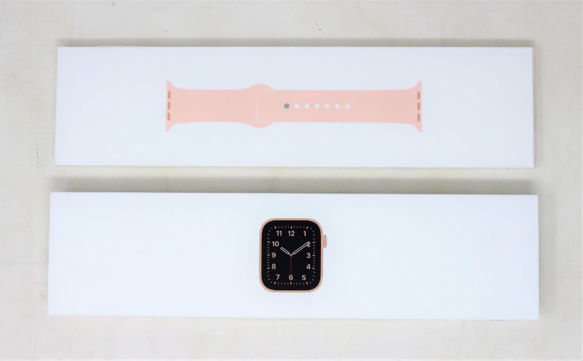 A pre-owned Apple Watch SE GPS(MYDN2B/A A2351) 40mm Gold Aluminium Case with Pink Sand Sport Band (Boxed, USB charger cable included) (Serial: H4HF32ZFQ07T) (iCloud activation clear).