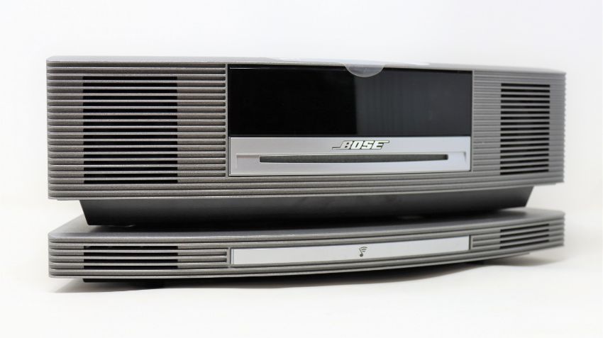 A Bose Wave System III and WiFi soundtouch pedestal in silver (possibly pre-owned) (includes remote control and cables. No box).