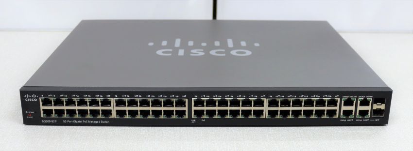 A pre-owned Cisco 52 port managed network switch (PN: SG300-52P)