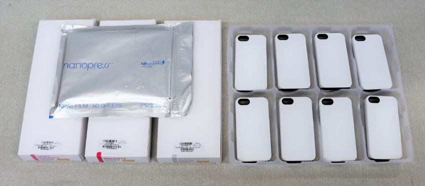 A box of IDT systems custom phone case printing consumables to include: 12x case blacks for iPhone 5/SE, 2x D4.2 transfer film rolls (200mm x 40m), 1x package of NPA5 film (50 sheets), 3x inks (ADS3D4880M, ADS3D4880LM, ADS3D4880LLK).