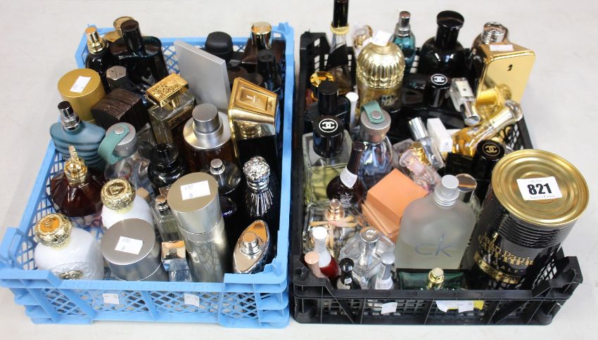 Two crates containing part used parfums/toilette to include Jean Paul Gaultier, Chanel, Calvin Klein, Davidoff, Paco Rabanne and Mont Blonc (Approximately 60 items).
