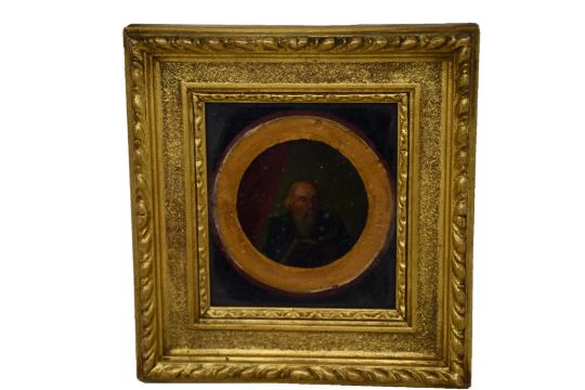 A Framed Miniature Painting Depicting the Scholar Saint Tikon of Zadonsk, Orthodox Icon, Artist unknown, Oil on panel, Possibly mid 1800's, Russia, Annotations verso, Panel 12 x 13.2 cm, frame 19.5 x 20.8 cm.