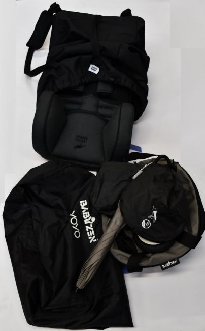 A Babyzen Yoyo bag and an Urban Kanga TV107 portable travel seat.