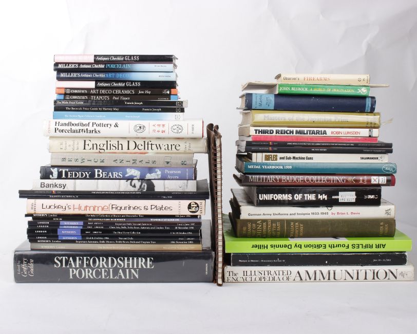 A Collection of antique reference books to include Handbook of Pottery & Porclain Marks by JP Cushion, Staffordshire Porcelain by Geoffrey Godden, English Delfware by F.H Garner, The Ceramic art of China & other countries of the Far East by William Bowyer Honey, Luckey's Hummel Figurines & Plates by Carl F Luckey, Teddy Bears by Sue Pearson and Dottie Ayers, A Charlton Standard Catalogue Beswick Animals 8th Edt by Callows and Sweet, Military Badge Collecting by John Gaylor,Medal Yearbook 1999 from the publishers of Meal News, Profiles of History Hollywood Auction July 30-31 2012 plus others.