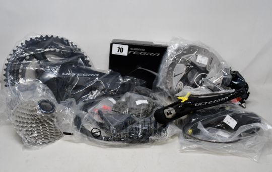 An as new Shimano R8000 Ultegra 11 Speed Road Bike Groupset comprising ST-R-8020 STi brake/shifter units (Cable shift/hydraulic braking), BR-8070 flat mount brake calipers, front adaptors and small parts, FC-R8000 chainset, 50/34 chainrings, 172.5mm crank arms, SM-BBR60 bottom bracket cups, CS-R8000 11-28 11 speed cassette, RD-R8000 SS rear mech, FD-R8000 front mech, Hyperglide 11 speed chain, SM-RT800-SS brake rotors, Ice tech Ø140mm, centre lock, PD-R8000 clipless pedals.