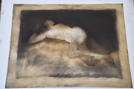 Two 20th Century Nude Etchings On Paper, Artist unknown, One overworked with chalk and gold coloured paint, 91 x 70 cm each, (2).